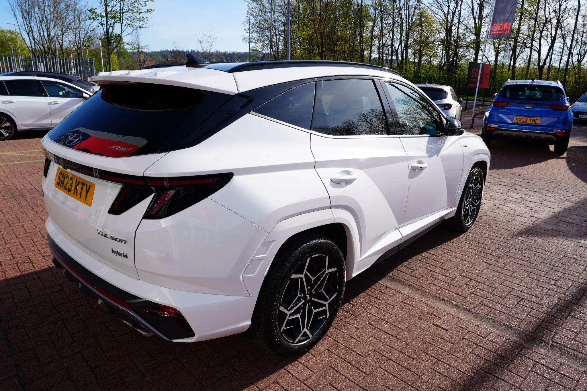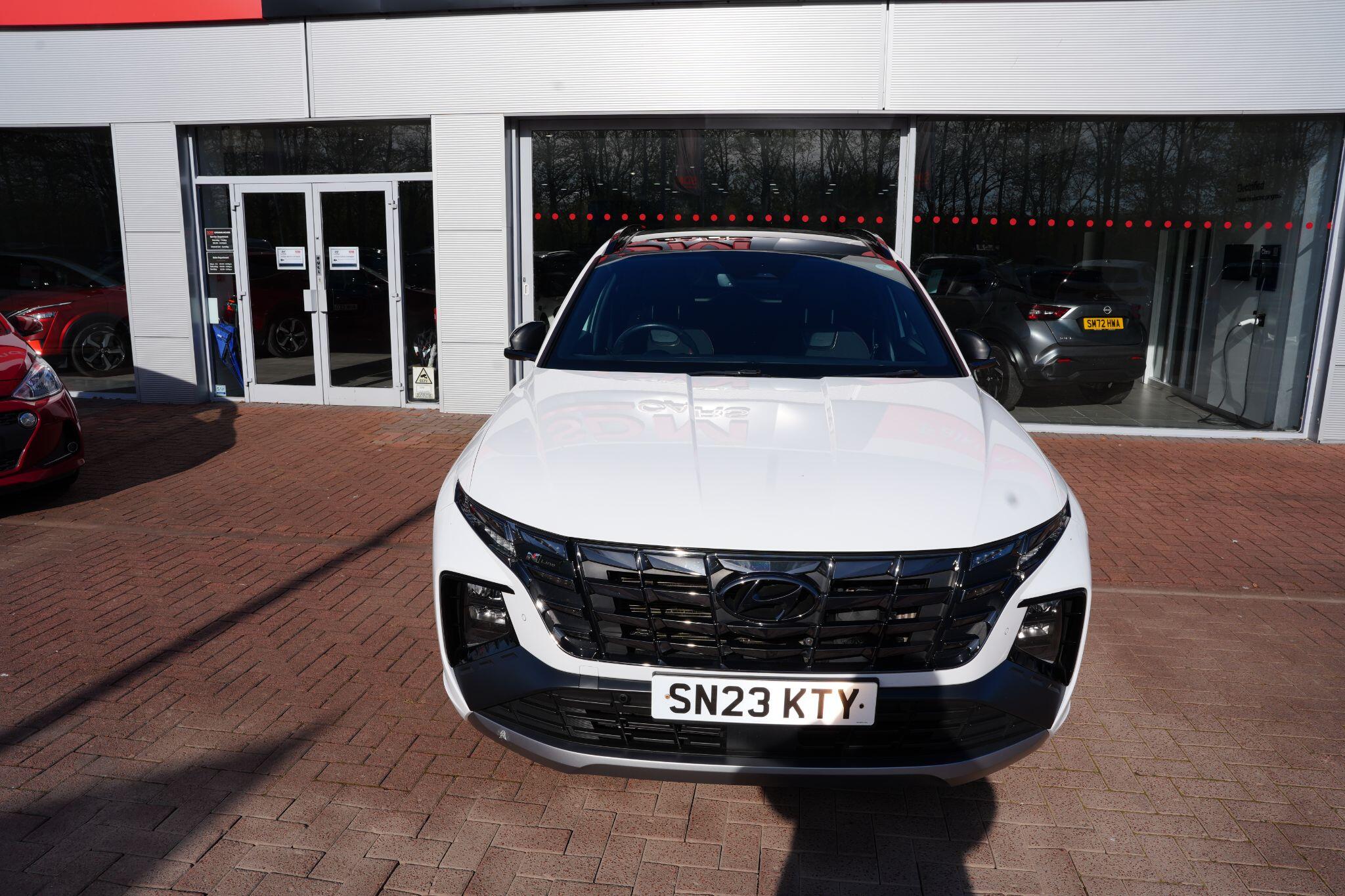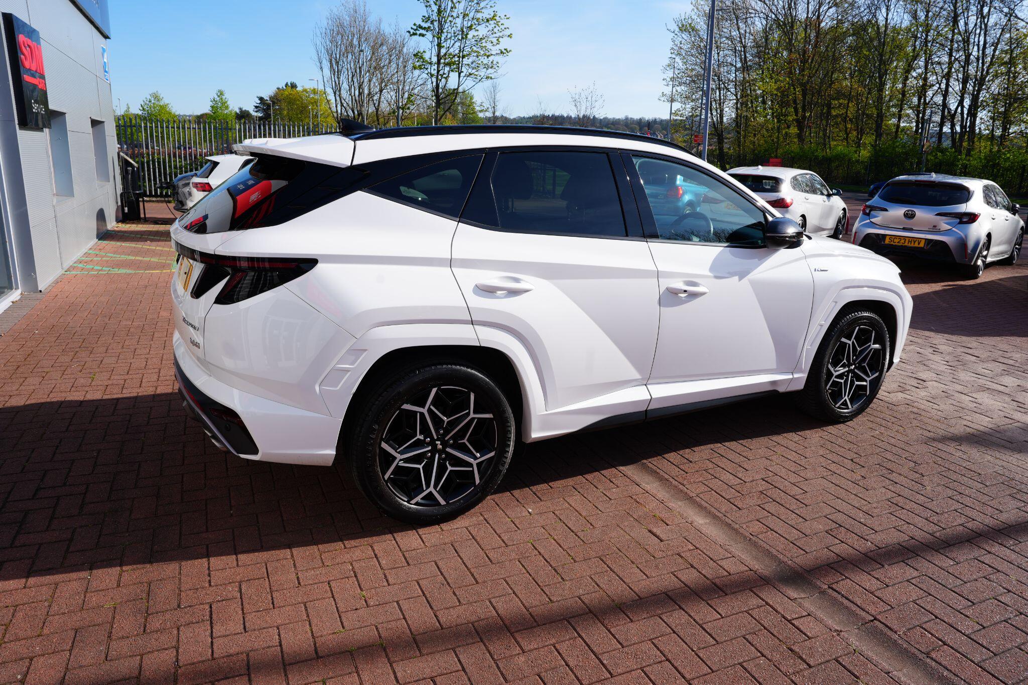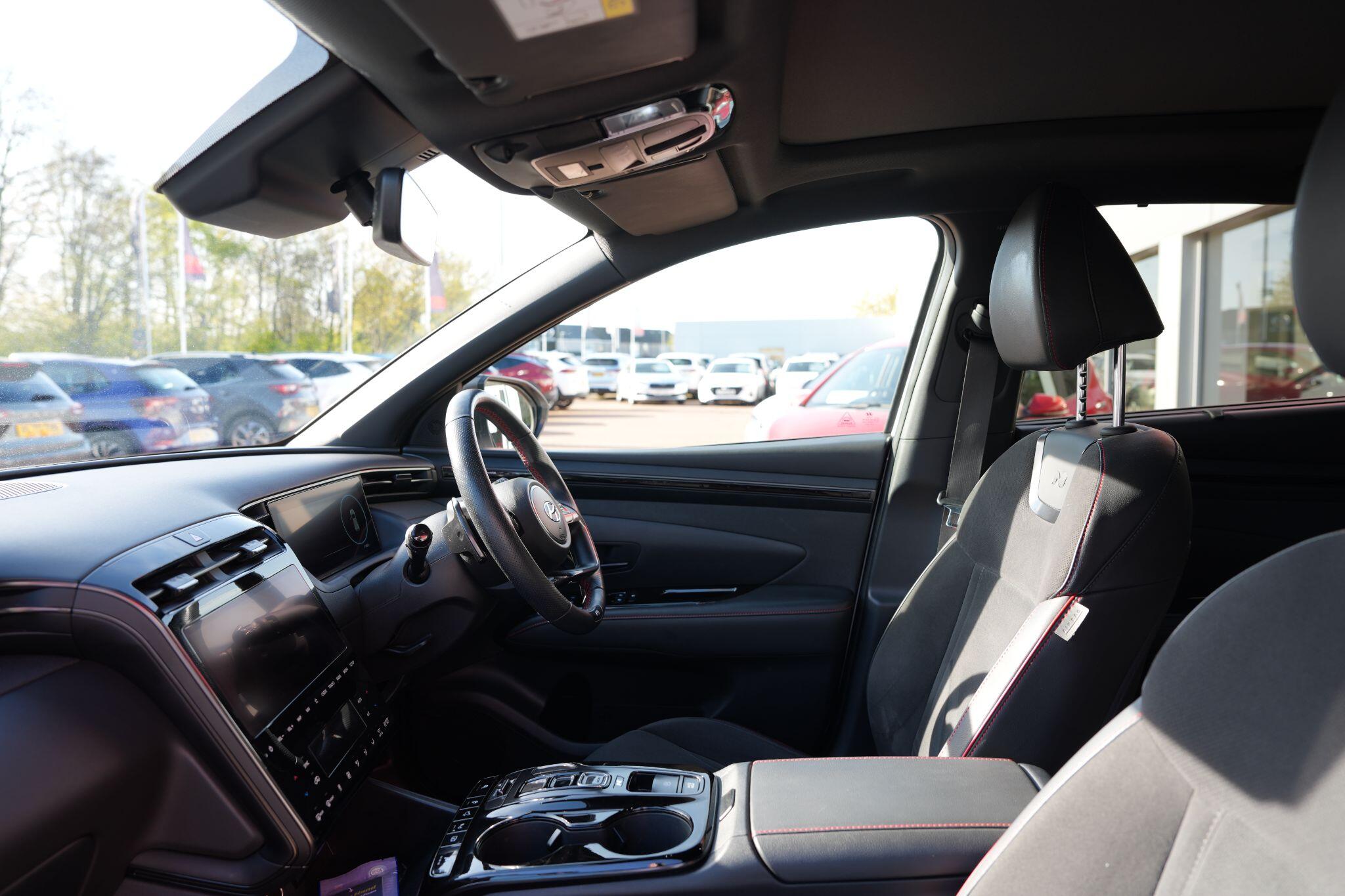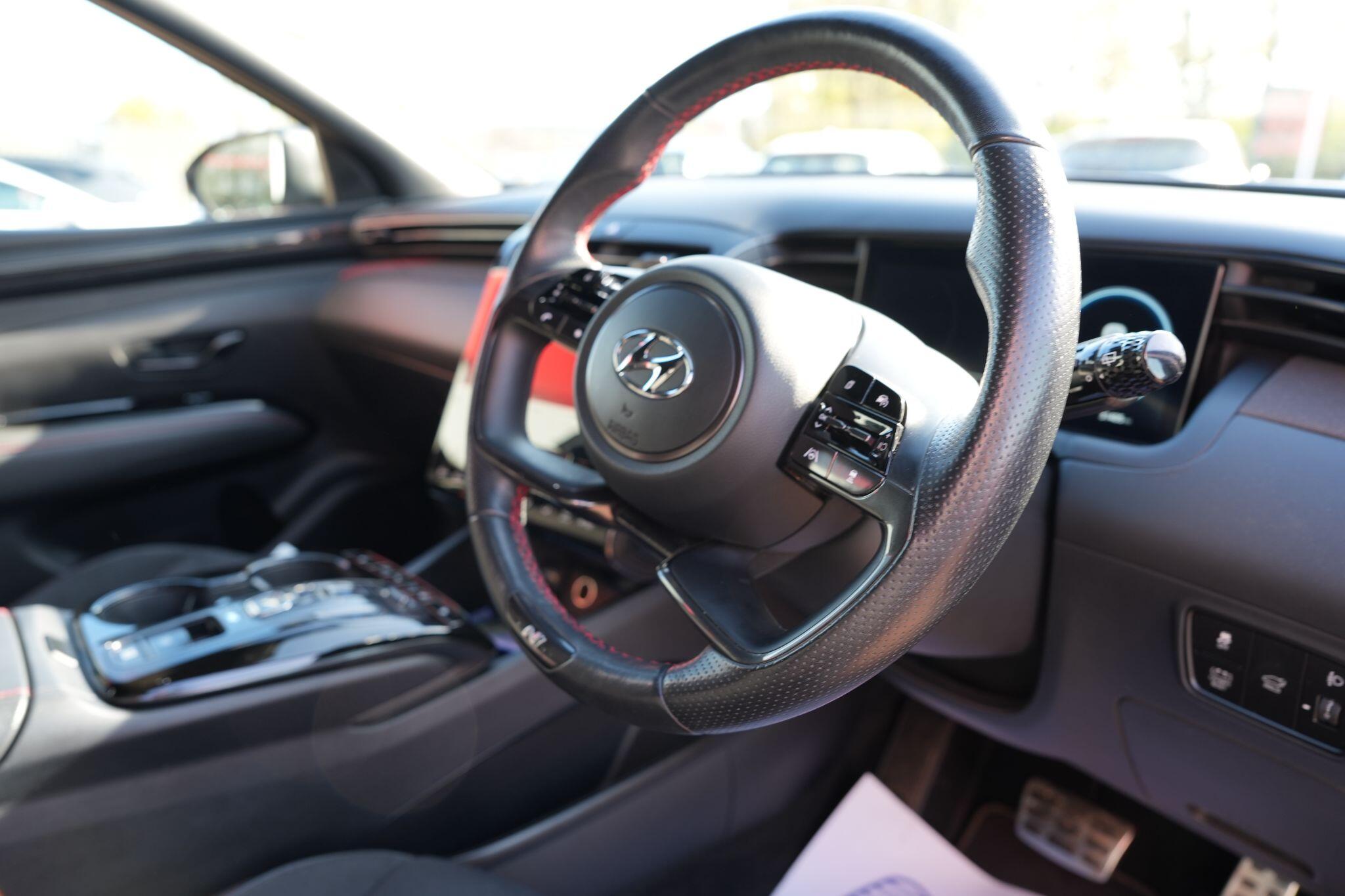 This 2023 Hyundai TUCSON h T-GDi N Line S is a superb example, having had only one owner since new. This stylish SUV boasts a 1.6 litre petrol hybrid engine, meeting Euro 6 emissions standards. Inside, you'll find comfort and convenience with heated front seats, three zone climate control, and seamless phone connectivity via Android Auto. Driving is made easier with automatic headlights that activate at dusk, and smart adaptive cruise control with a stop and go function.The TUCSON N Line S offers a compelling driving experience, highlighted by its brisk 0-62mph acceleration in just 8.0 seconds, demonstrating its performance advantage over similar vehicles. Its practicality is further enhanced by a generous boot space, making it ideal for families or those needing extra room. Additionally, this model benefits from a low insurance group, indicating it is more economical to own and run compared to many other cars in its class.